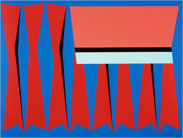I managed to make it to the last Free Sunday opportunity to see “The Birth of The Cool” at the Oakland Museum of California, before the exhibition closes on the 17th of August, 2008. Karl Benjamin’s smart and joyful canvasses stood out. I am not sure if it had anything to do with that I was dressed in my favorite shades of red, and blue, which matched my favorite paintings by him, but here they are.