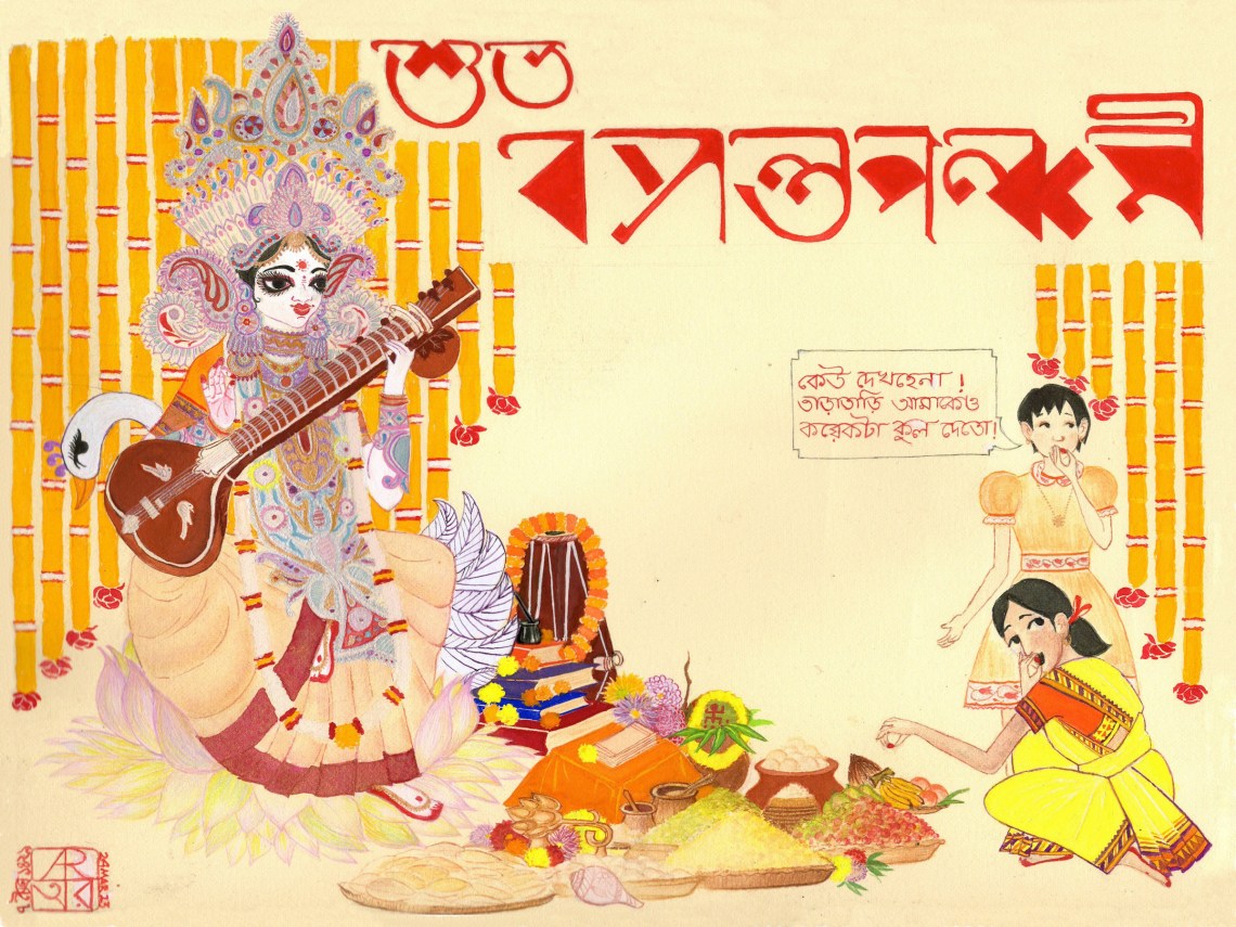 Its the fifth (panchami) day of Spring (Basant) in Bengal and with it comes this festival dedicated to the Goddess of Knowledge, Saraswati. I used to love everything about this festival. It’s a day of freedom from learning as we surrender our books, instruments, ghungrus (dancing bells), pens and pencils in front of the Goddess of learning, so that she can bless each one of these tokens of learning and make us fruitful in our pursuit of knowledge and wisdom. It is often very intimate in scale and for us, it was always held at one of my favorite family’s home – the Chatterjis.
